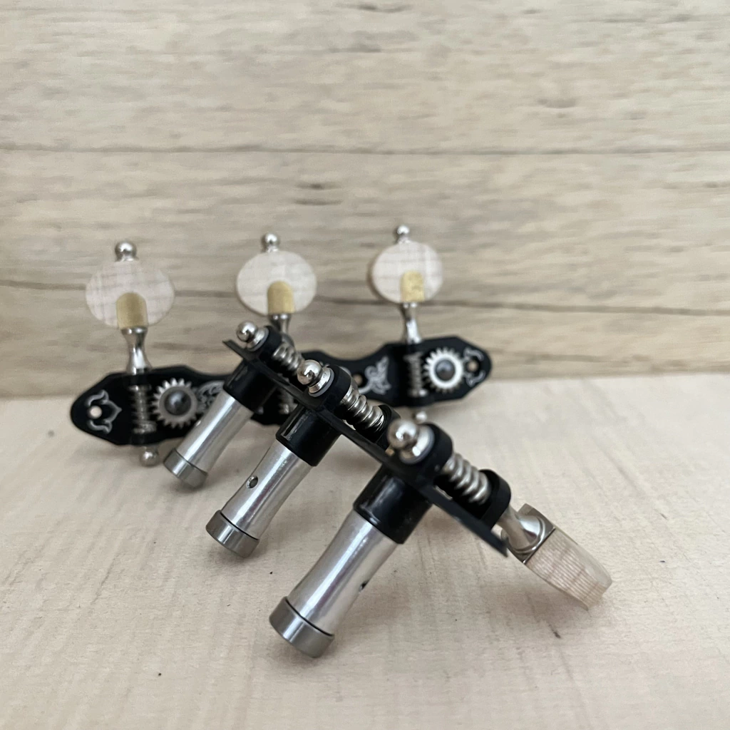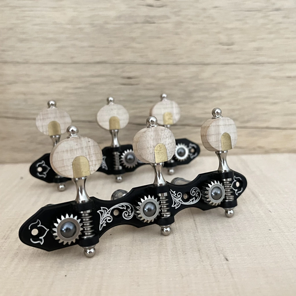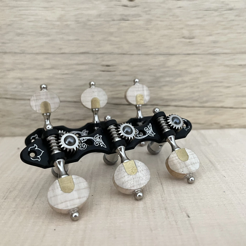 DESCRIÇÃO TÉCNICA: Modelo: Linha Solista Modelo e acabamento da base Plate: M3 em alumínio preto Acabamento Sem Fim e Engrenagem: latão em niquel Tipo de pino: Pino Grosso Aluminio Brilhante Botões: Standard madeira Maple Engrenagem: Gear Ratio: 18:1 (18 dentes)