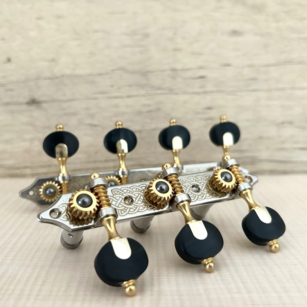 DESCRIÇÃO TÉCNICA: Modelo: Linha Maestro Modelo e acabamento da base Plate: M1 latão niquel Acabamento Sem Fim e Engrenagem: latão em dourado Tipo de pino: Pino grosso Aluminio Brilhante Botões: Standard em Madeira Resina Perola Negra Engrenagem: Gear Ratio: 18:1 (18 dentes)